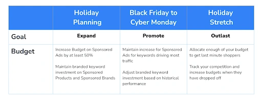 Four Ways to Get You Holiday Ready with Amazon Advertising 6 minute read Published: November 10, 2021 Modified: March 10, 2022 Share: URL copied Trusted by 4M+ Businesses Scale your brand profitably across Amazon and TikTok Get Diamond Plan Table of Contents 1) Plan Your Budget Ahead of Time & Adjust Accordingly2) Adjust Your ACoS ExpectationsACoS vs. TACoS3) Get Clear Insights to Make Informed Optimizations4) Leverage Sponsored Brand VideoGood Luck This Holiday Season! Achieve More Results in Less Time With Helium 10 Sign Up For Free Trusted by 4M+ Businesses Scale your brand profitably across Amazon and TikTok Get Diamond Plan The holiday season is approaching! Amazon sellers are making their product listings and checking them twice. Likewise, Helium 10 recently held a very special holiday readiness presentation: The PPC Playbook + Video Ads Webinar! The webinar covered how to prepare Amazon sellers for the upcoming holidays, specifically by providing them with practical PPC (Pay Per Click) strategies they can implement during the most wonderful(ly busy) time of the year. In case you missed it, here are the important takeaways on ACoS, holiday campaign budgeting, the value of Sponsored Brand Videos, and more. If you’re selling on Amazon this holiday, check out this Amazon FBA PPC software and read on to ensure you have a successful selling season! 1) Plan Your Budget Ahead of Time & Adjust Accordingly This might be a given, but nevertheless, planning your budget is instrumental to successful holiday sales. If you sold the same product last year, you may have data on hand to help project what to expect this holiday season. Depending on when you started with Helium 10, you can see that data from last year using Adtomic. If you are a newer seller without any data from the last holiday season, you can still take into consideration your recent daily spend and ask yourself, “Is my budget sufficient enough to account for at least 2x the clicks?” In order to take advantage of this busy period, campaign budgets should be increased so that they stay active and enabled throughout the day. Here is an example of a holiday budget plan: There are also new Budget Rules within Amazon that can be created per campaign for those products that may have high demand during the holidays.Use Amazon’s present budgets like Black Friday or Cyber Monday to automatically increase your campaign’s budget. You can select a recommended percentage or create your own. 2) Adjust Your ACoS Expectations If the goal is to remain profitable on your PPC campaigns during this time, you should know your “break-even” ACoS. Your “break-even” ACoS is the point where you will start losing money from advertising after product costs and fees. However, if you really want to take advantage of the increased traffic and take an aggressive approach, then the higher your ACoS target is, the better. Aiming too low during the holiday season may cause you to prematurely optimize your campaign before the really high traffic days, causing you to miss out on sales. Looking at the bigger picture though, your total sales, and therefore, your total ACoS (TACoS) is another important metric to gauge the success of your advertising during the holiday season. Helium 10’s Adtomic has an easy way for you to monitor these important metrics under our Analytics section. In Adtomic, receive suggestions on all keywords and targets on your ACoS goal. Increase your ACoS Target to take a more aggressive approach during the holiday rush. Beyond ACoS, suggestions include increasing or decreasing bids based on clicks, impressions, and potential conversions. These suggestions can be manually applied or set to run automatically. ACoS vs. TACoS PPC is not just about the sales you make from PPC. It’s about the branding effect it has on shoppers. The more a shopper sees your product in an ad, the more likely they are to recognize it the next time they search. This process helps increase organic sales. Since PPC helps with organic sales, we should consider those metrics in our calculations to gauge advertising effectiveness. This is where Total ACoS or TACoS comes into play: ACoS: PPC Spend / PPC Sales TACoS: PPC Spend / Total Sales (Organic plus PPC Sales) 3) Get Clear Insights to Make Informed Optimizations Search terms are ultimately your touchpoint customers, so understanding how they are performing is essential to a healthy PPC account. Knowing what is helping on the search term level is one of the most important indicators of actual advertising performance. Adtomics’ new Search Term Detail Page allows you to look at search term performance over time across your entire account, giving you insight into the behavior of your advertising campaigns in incredible detail so that you can drive traffic to your highest performers. This page allows you to easily visualize how a specific search term is performing across all of your keywords in your account. Similarly, the Keyword Detail Page is another powerful way to get a deeper insight into your important targets/keywords in an account. Adtomic’s Analytics page already provides sophisticated insights into keyword performance, but the Keyword Detail Page takes it a step further. Now, you can see a chart that shows keyword performance over time. This gives you unprecedented insight into which campaigns your keywords are performing, which in turn gives you greater control over who is seeing your advertising. 4) Leverage Sponsored Brand Video If you’re on the fence about the effectiveness of Sponsored Brand video, here is one major reason to give them a try… 1 in 5 Amazon visitors has made a purchase as a result of watching a brand or product video.Survey by Amazon conducted using Google Consumer Surveys, July 2019 That’s a very compelling reason in our book!But before you dive into creating your video for your listing or for PPC, here are some tips: 1. Know your audience. Content should be educati