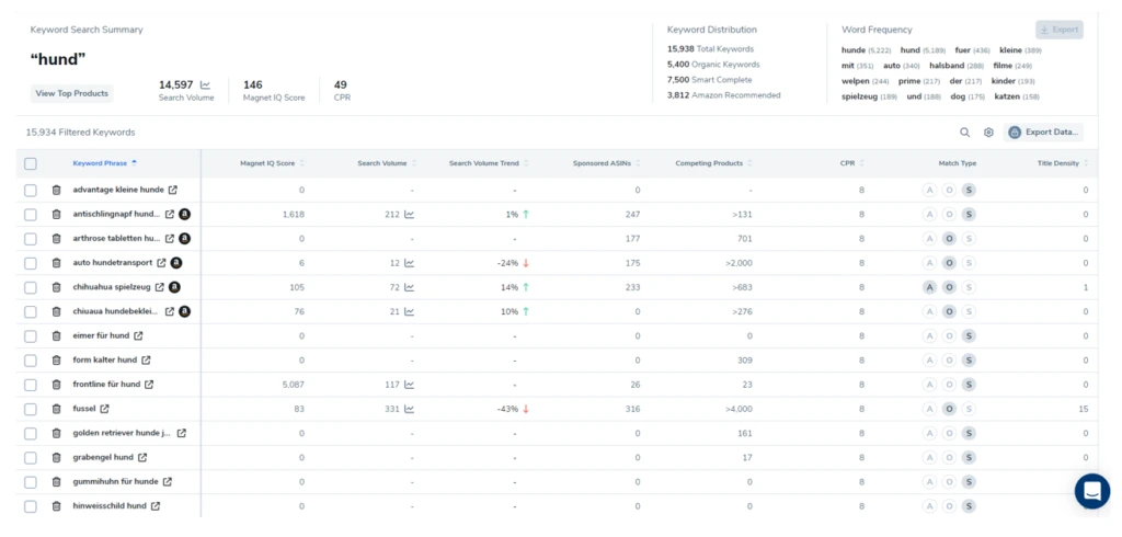 Nun geben wir ein Keyword in Helium 10 Magnet ein, welches zu der Nische passt, die wir analysieren wollen. In unserem Beispiel suchen wir einmal exemplarisch nach dem Keyword „Hund“.