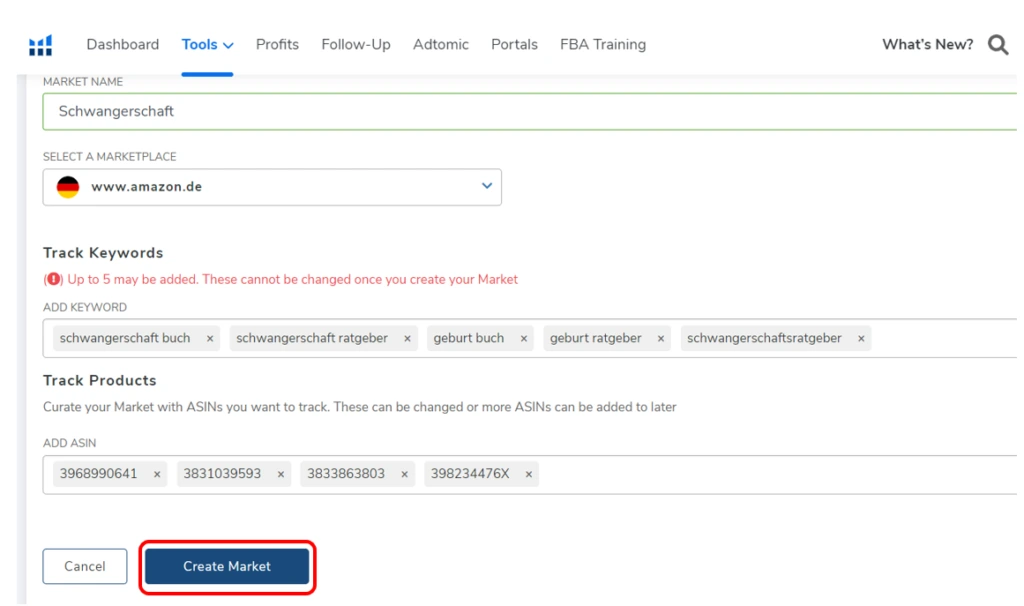 Wenn du alle notwenigen Keywords und ASINs eingetragen hast, kannst du auf „Create Market“ klicken.