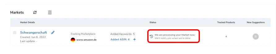 Im Reiter „Status“ kannst du sehen, dass Helium 10 den Markt nun analysiert. Dies kann je nach Markt und ausgewählter Produkte bis zu 24 Stunden dauern.