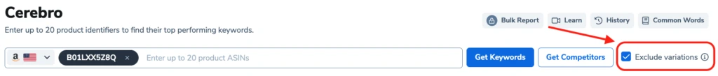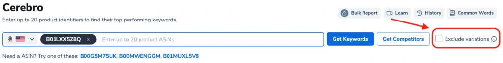 As we all know, whenever you enter an ASIN into Cerebro, it will automatically search for all kinds of keywords that are relevant or indexed for that ASIN. However, if the ASIN you enter is a part of a variation, then Cerebro, by default, will search for all relevant keywords for all Child ASINs within that variation.