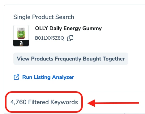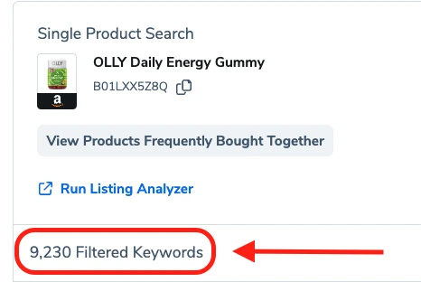 I found a random product on Amazon, and let’s say that I’m considering entering the energy supplement niche. Right here, you can see that this Daily Energy Olly product is a part of a variation with ASINs of different flavors and different types of product packaging. But I’m only concerned about the Daily Energy flavor in the Bottle packaging. Now, if I enter this specific ASIN into Cerebro, I get around 9,000 keywords back.