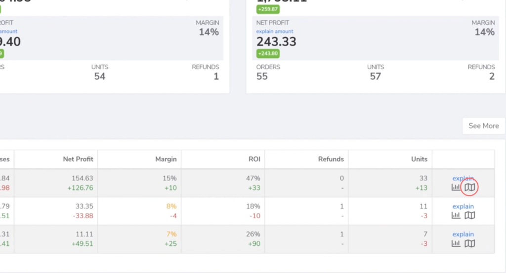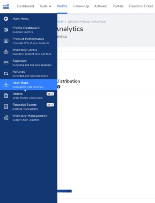 While viewing any product in your main Profits dashboard, direct your attention to the far-right column. You should see what looks like a folded map icon. Clicking on this icon will also take you to your inventory Heat Map.