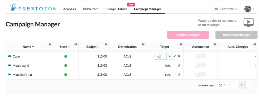 Setting ACoS Targets 5 minute read Published: October 6, 2017 Modified: November 5, 2020 Share: URL copied Trusted by 4M+ Businesses Scale your brand profitably across Amazon and TikTok Get Diamond Plan Table of Contents Why Is This Important?How to Choose Your ACoS target?Start with a Moderate TargetOther Considerations for Optimum ACoS TargetSetting ACoS Targets for Different GoalsACoS Targets Also Determine Color-Coding in AnalyticsIn Summary... Achieve More Results in Less Time With Helium 10 Sign Up For Free Trusted by 4M+ Businesses Scale your brand profitably across Amazon and TikTok Get Diamond Plan Our #1 piece of advice in setting your Automation ACoS targets? Don’t set them too low. Start moderate, you can always lower them gradually after you reach the first target. Otherwise, you risk losing sales volume. Why Is This Important? There is a healthy balance to strike between ACoS and sales volume. Higher bids lead to more impressions and sales, but also higher ACoS. If you set your Prestozon ACoS targets too low, the algorithm will try to reach those targets by lowering your bid, meaning you may risk losing too many impressions and therefore sales. How to Choose Your ACoS target? The basic rule of thumb is to set your target to an ACoS that you know is possible based on prior experience with that product or similar products. For example, if you have a campaign running at 40% ACOS right now and it has never run below 30%, then an ACOS target of 20% is probably not achievable. Our algorithm will try to hit it, but there just might not be any sales at that level. If you don’t have any experience to base your target on, then we recommend choosing an ACoS target of your profit margin for that product. A common profit margin is 30%, though this varies widely. Another thing to consider is that ad sales help drive organic sales, so a slightly higher ACoS is often worth it. Essentially, you can pay a little more for ad-driven sales to increase where your listing shows up in organic rankings. And keep in mind that you may have to aim higher if you don’t have many reviews yet. Start with a Moderate Target Remember, you aren’t locked into this target forever! You can start moderate and then work your way down. For example, start at a target of 30%, then drop to 25% once you’ve achieved 30%, and so on until you start seeing sales drop lower than you want. Other Considerations for Optimum ACoS Target There are many factors to consider when setting your ACoS target including: The lower you bid, the fewer impressions you’ll get, but the lower your cost per click and therefore probably also a lower ACoS.The higher you bid, the more impressions you will get, but the higher your cost per click and therefore probably also a higher ACoS.Higher bids often give you a better placement in search results which have better click-through rates (CTR) and conversion rates – counter-intuitively, this can lower your ACoS. This is another reason you don’t want to set your ACoS targets too low – low bids might miss this opportunity. Setting ACoS Targets for Different Goals There may be times when you want to set ACoS targets for goals other than campaign efficiency. Here are some suggestions from the Prestozon team when targeting different goals: Product Awareness – Sometimes you want a product to be seen and you’re okay with spending a little more money to make that happen. For product awareness campaigns, like when you are first launching a product, we suggest setting the ACoS target at 100%, this way you are targeting towards breaking even with your spend vs sales. Do note that other aspects of your Amazon listing (like reviews, pictures, and product information) will have a large effect on the success of your ads. These aspects should be considered before you start looking at ad spend.Organic Sales – Ad spend helps with organic sales and organic sales may help your click through rate when your ad appears. If your campaigns have a very high ACoS, but you’re worried that you’ll lose organic sales if you lower ad spend, we suggest lowering your budget for a week or two to see if your ad spend affects your organic sales at all. If it doesn’t, then you can start targeting more efficiency without fear of losing your organic sales. If it does, then consider a higher ACoS target to keep your visibility up. These are just two examples of goals outside of ad spend efficiency. If you have others, message us at support@prestozon.com and we’ll help you make sure Prestozon is targeting right for your needs. ACoS Targets Also Determine Color-Coding in Analytics You’ve seen the green, orange, and red coloring of ACoS in your Analytics and Bid Wizard tables. Did you know that your ACoS targets determine this color-coding? Green = ACoS is at or below target for that campaign Orange = ACoS is above target but still below 2x target Red = ACoS is higher than 2x target In Summary… Prestozon automation tries to achieve your target ACoS, which you specify per campaign.If you put the target too low, you risk losing much of your sales volume.We recommend putting the lowest ACoS that you think is realistic based on prior experience.If you don’t have prior experience, use your profit marginErr on the high side, because you can always lower it once you achieve it. Published in: Blog Share: URL copied Share: Published in: Blog Thought Leadership, Tips, and Tricks Never miss insights into the Amazon selling space by signing up for our email list! Subscribe Achieve More Results in Less Time Accelerate the Growth of Your Business, Brand or Agency Maximize your results and drive success faster with Helium 10’s full suite of Amazon and Walmart solutions. Get Started